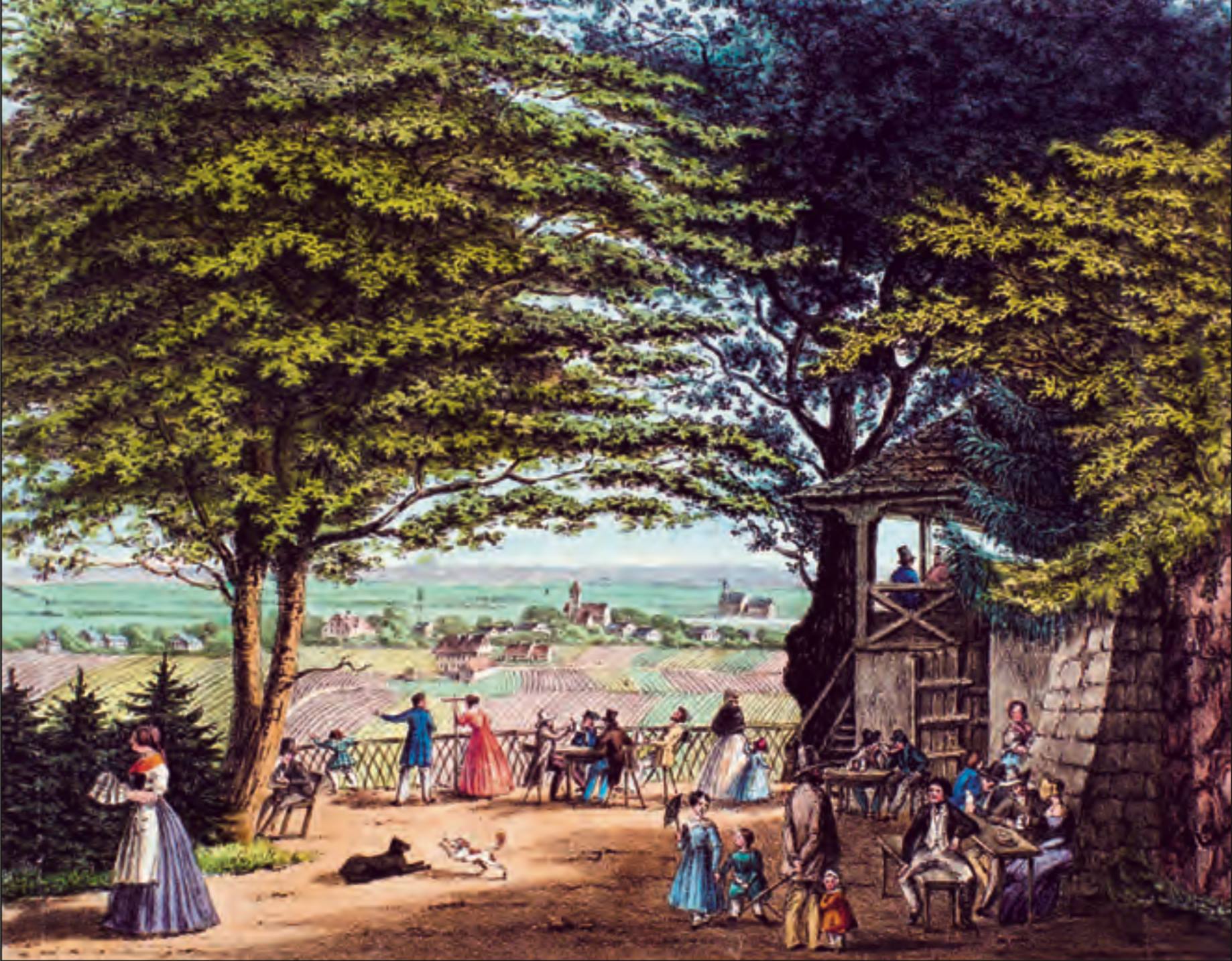 Der Wirtsgarten des Sommerkellers in der Biedermeierzeit, im Hintergrund ist die Dorfkirche von Tegernheim und auf der anderen Seite der Donau die Kreuzhofkapelle zu sehen.