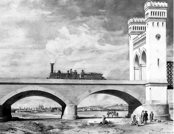 Um 1859 - Donaubrücke Schwabelweis aus der Aquarell-Serie "Ansichten von Ortschaften an den bayerischen Ostbahnen" von Albert Emil Kirchner